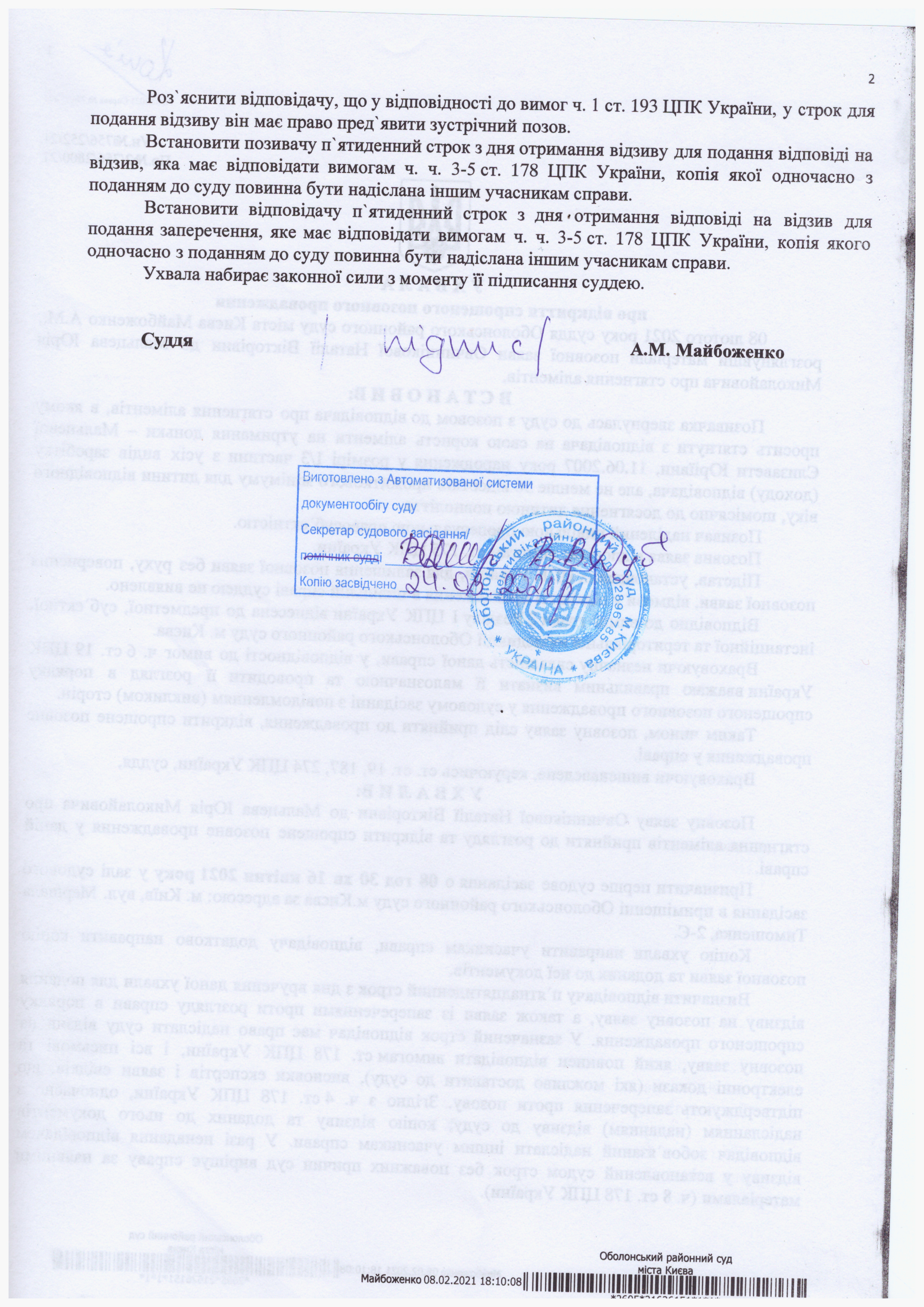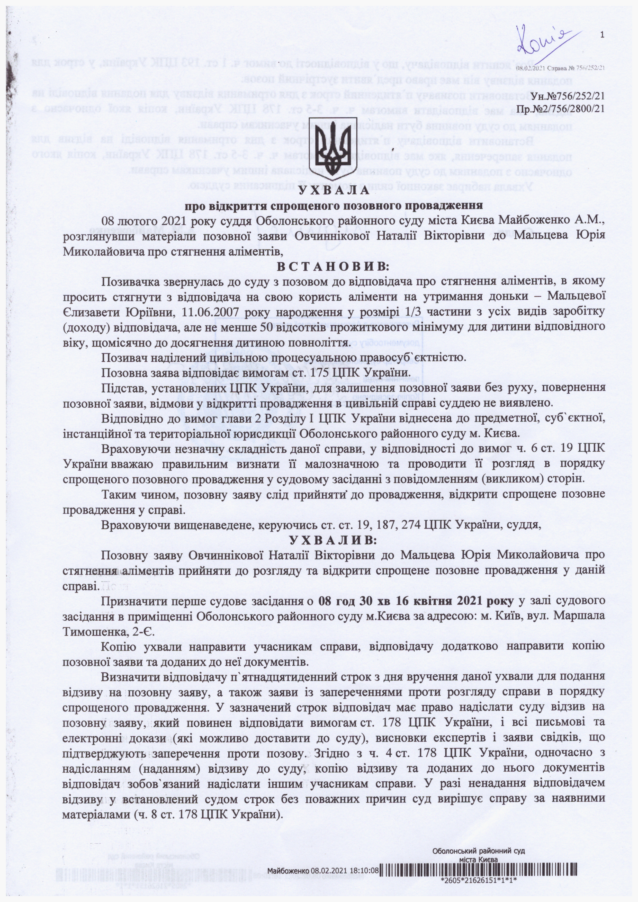 Оболонський районний суд міста Києва повідомляє відповідача Мальцева Юрія Миколайовича (Луганська обл., м. Антрацит, селище Кріпенське, вул. Рози Люксембург, буд.6), про те, що по справі №756/252/21 за позовною заявою Овчиннікової Наталії Вікторівни до Мальцева Юрія Миколайовича про стягнення аліментів призначено судове засідання, яке відбудеться у приміщенні Оболонського районного суду м. Києва (м. Київ, вул. М. Тимошенка, 2-Є, кабінет №22, 4 поверх, суддя Майбоженко А.М.) 16.04.2021 о 08:30 год.