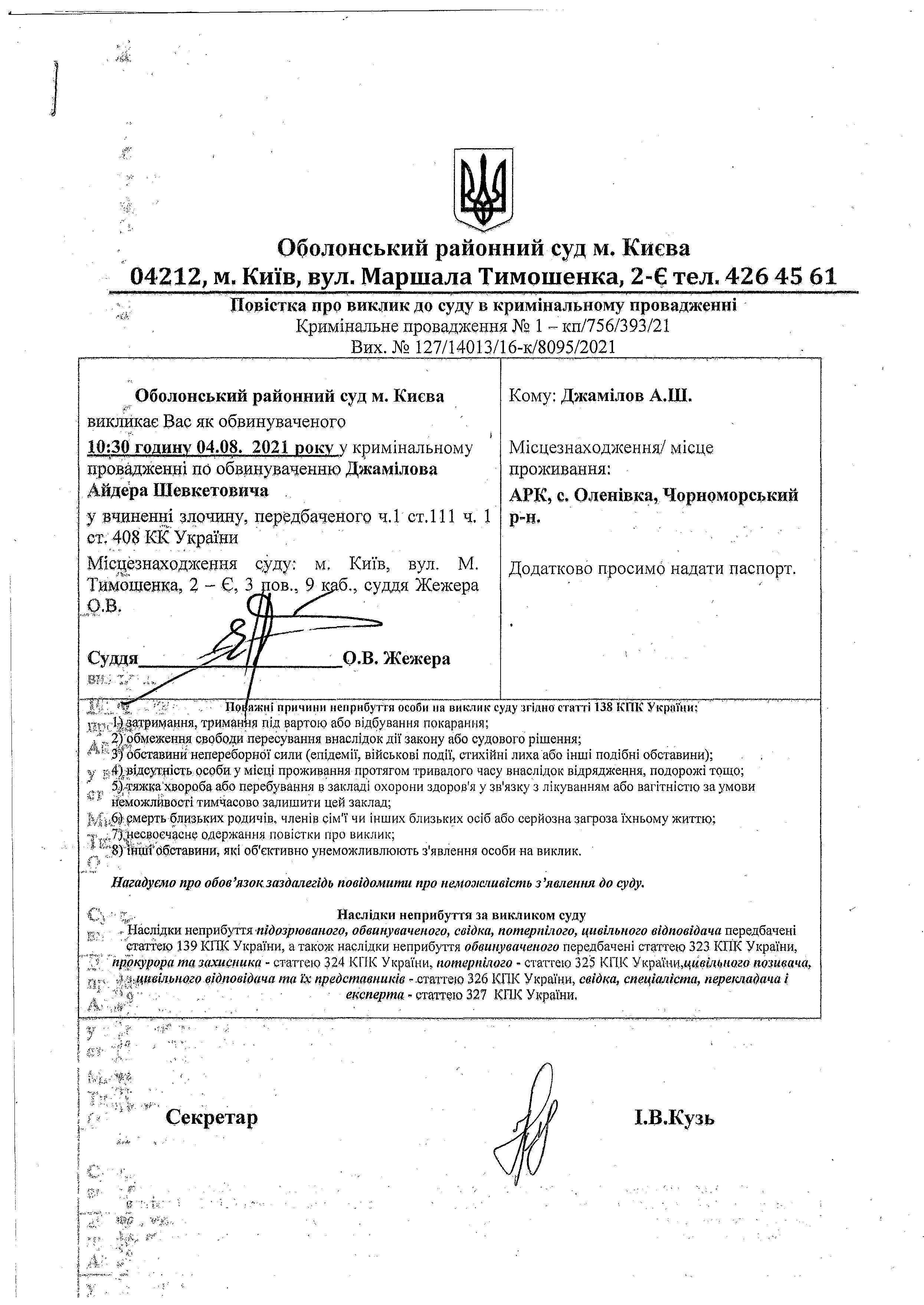 ОГОЛОШЕННЯ ПРО ВИКЛИК Джамілова Айдера Шевкетовича