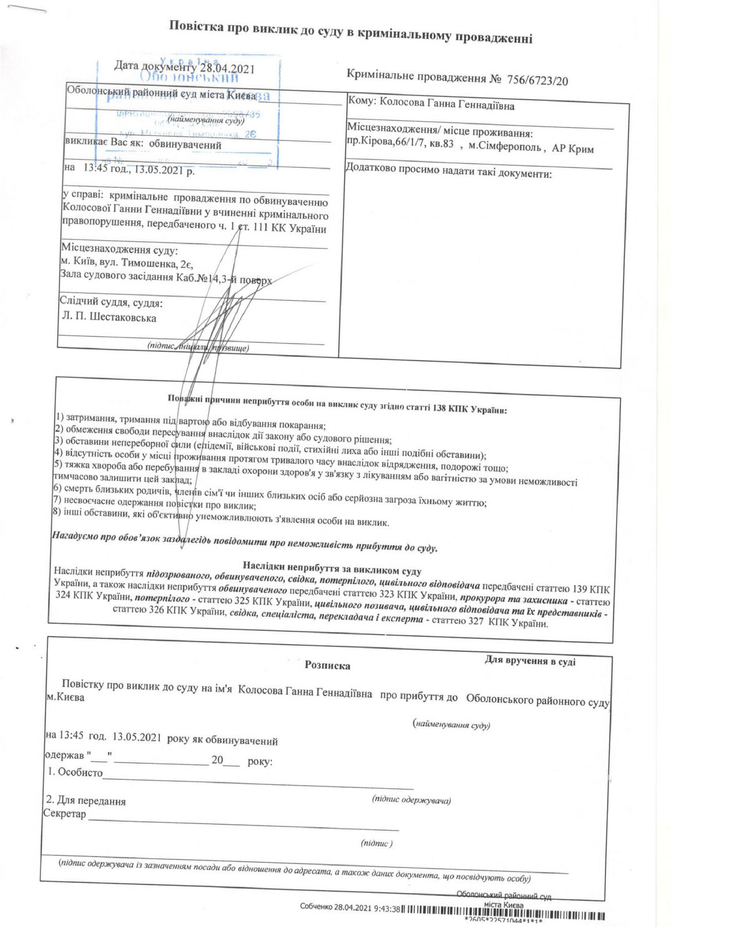 ОГОЛОШЕННЯ ПРО ВИКЛИК Колосову Ганну Геннадіївну