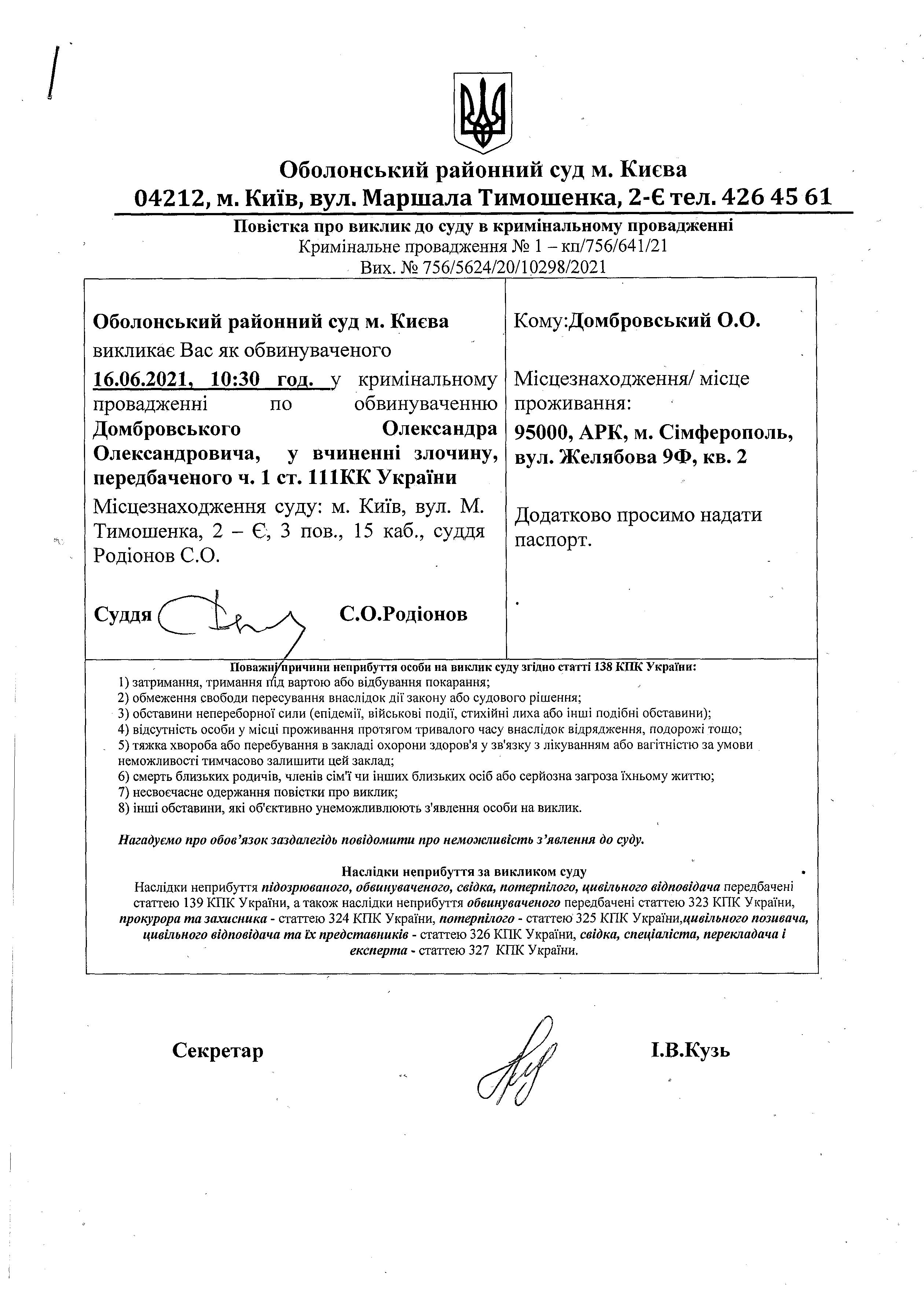 ОГОЛОШЕННЯ ПРО ВИКЛИК Домбровського Олександра Олександровича