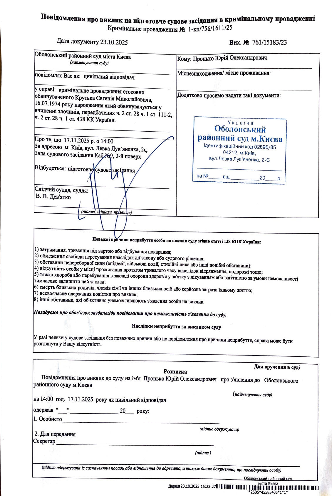 Оголошення про виклик до суду Пронько Юрій Олександрович