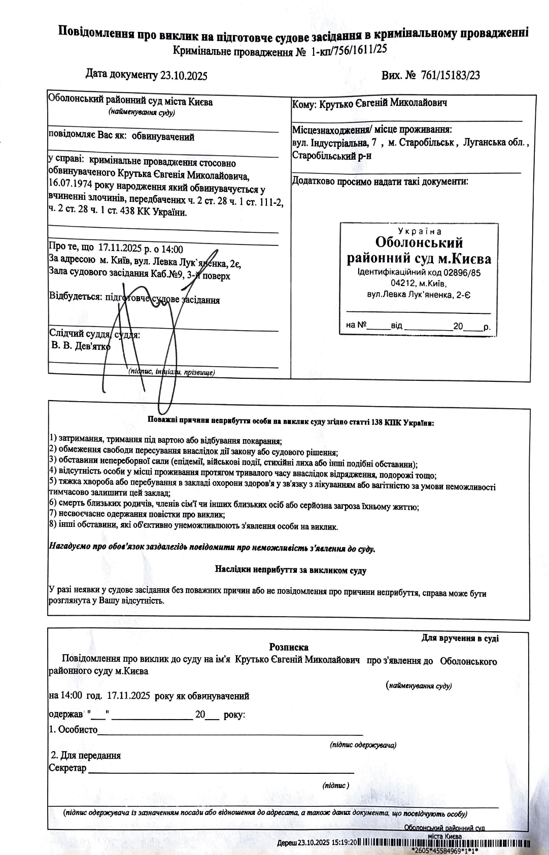 Оголошення про виклик до суду Крутько Євгеній Миколайович