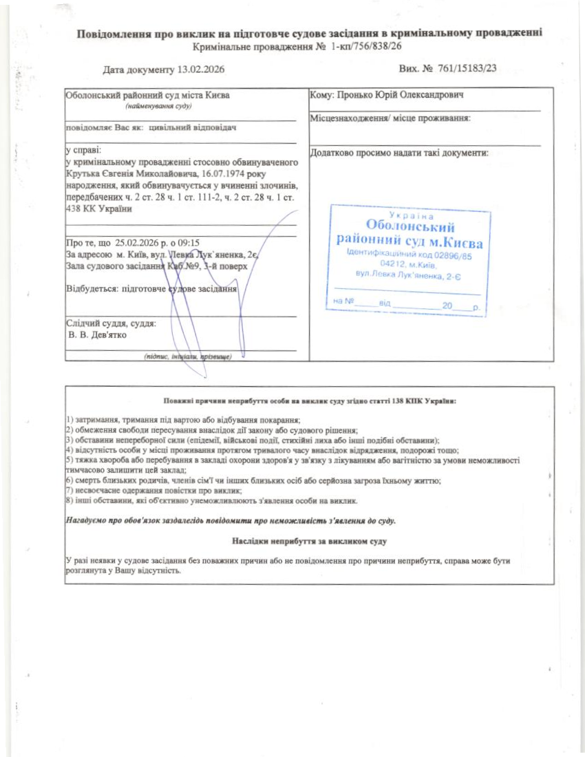Оголошення про виклик до суду Пронько Юрій Олександрович