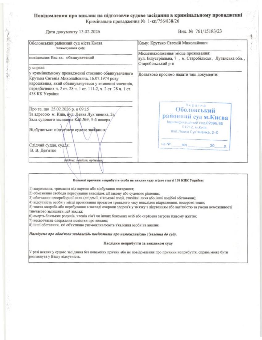 Оголошення про виклик до суду Крутько Євгеній Миколайович