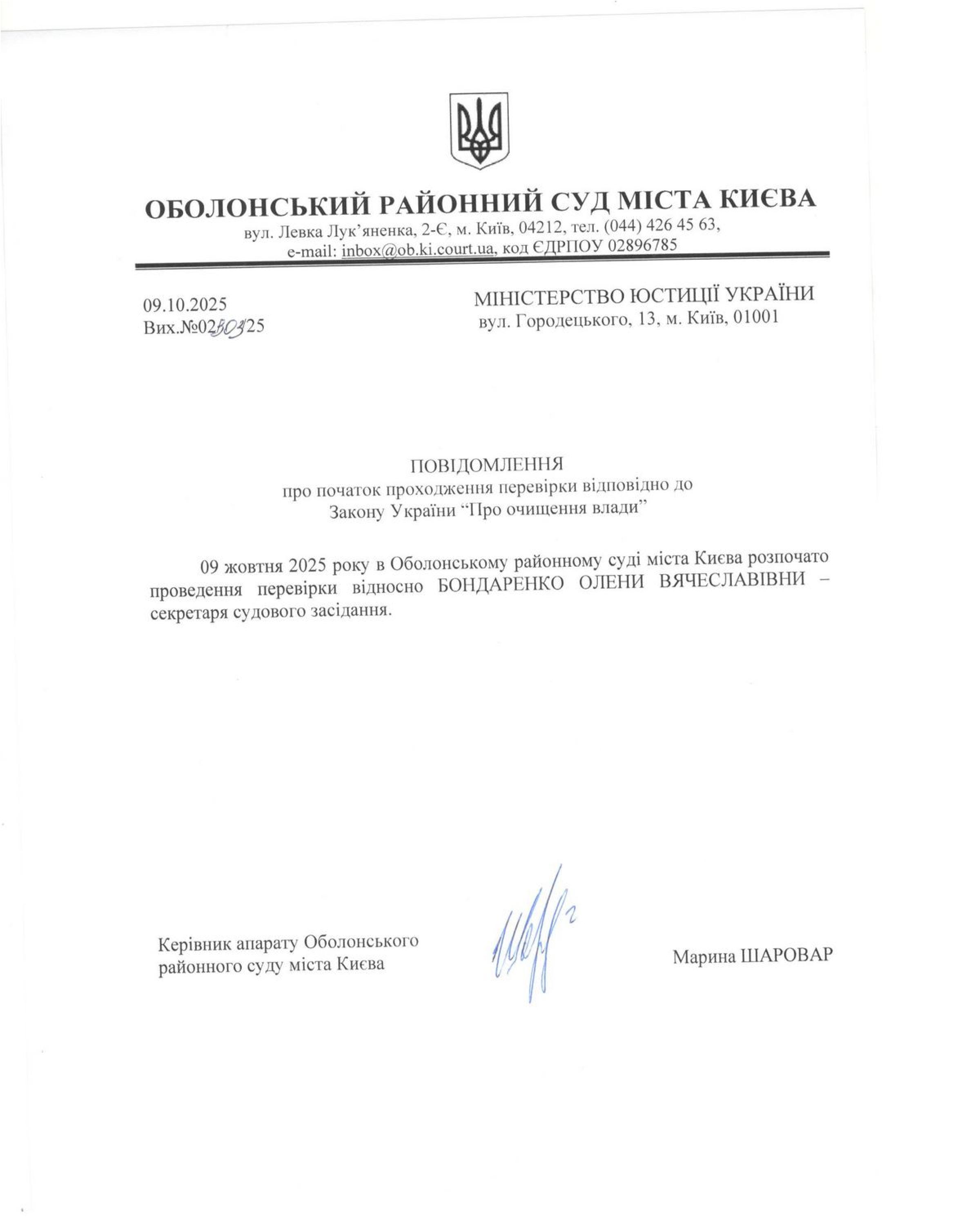 Повідомлення про початок проходження перевірки відповідно до Закону України "Про очищення влади" відносно Бондаренко О.В.